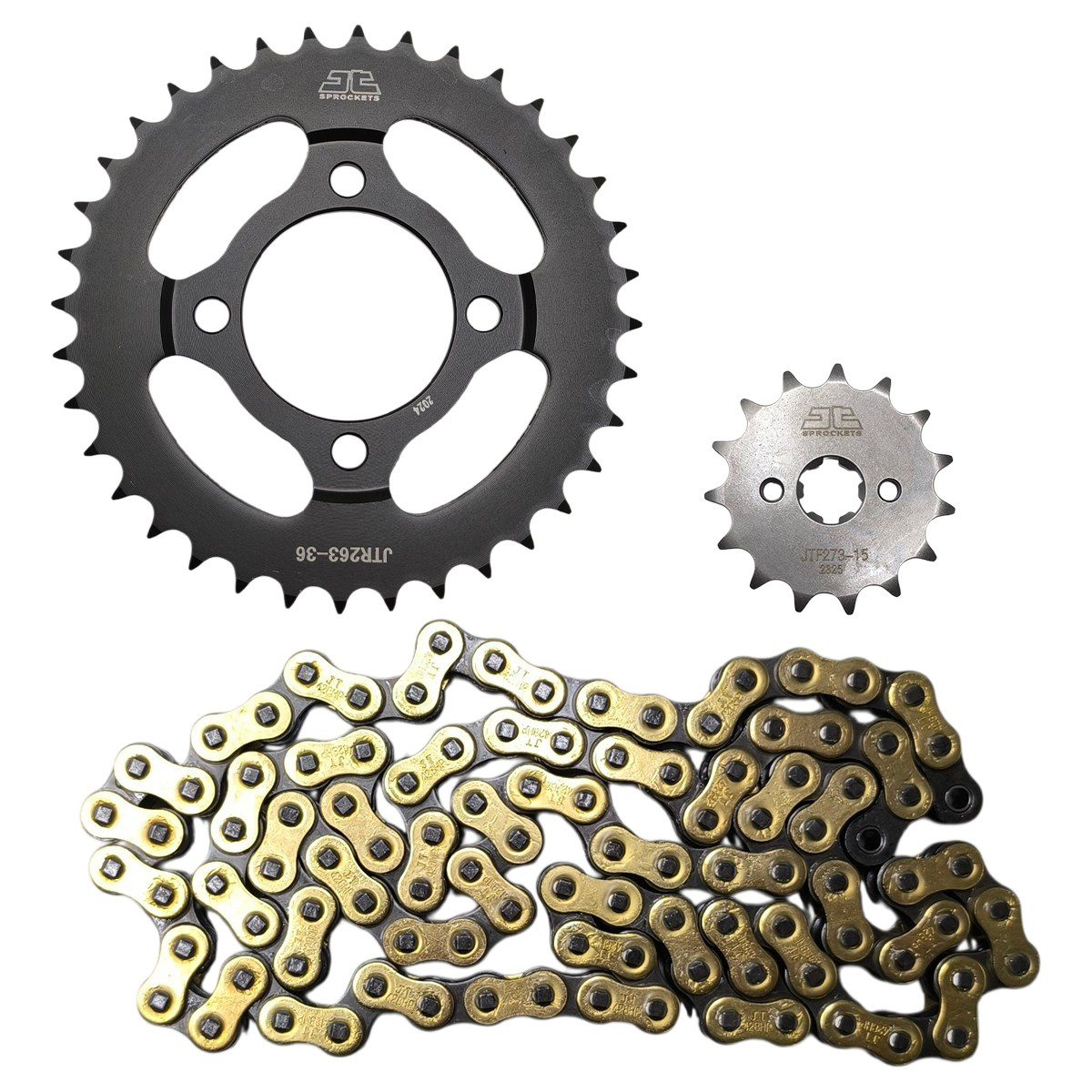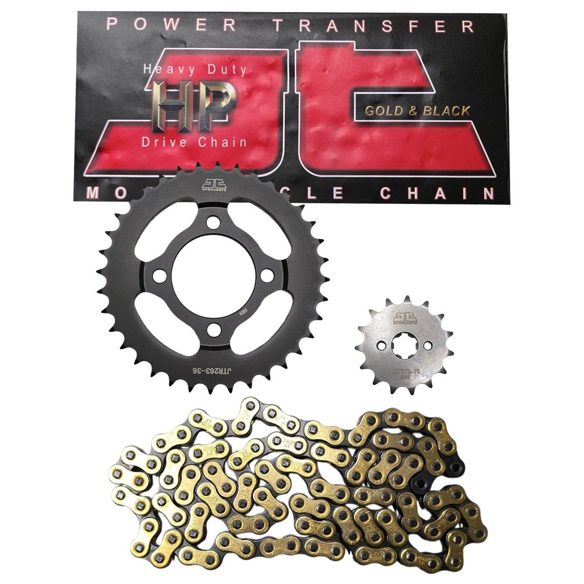 Αλυσιδογράναζα 428HP 15Δ 36Δ Daytona Sprinter 125 μαύρο χρυσό JT Τα αλυσιδογράναζα 428HP (15δ μπροστά / 36 δ πίσω) για Daytona Sprinter 125 JT είναι σετ εξαρτημάτων μετάδοσης που περιλαμβάνει εμπρόσθιο και οπίσθιο γρανάζι για την αλυσίδα 428, κατασκευασμένα για αντοχή στη φθορά και σταθερή μεταφορά ισχύος από τον κινητήρα στον πίσω τροχό, προσφέροντας καλή απόκριση, μειωμένη τριβή και αξιόπιστη λειτουργία της αλυσίδας σε καθημερινή χρήση, με το χρώμα να αναδεικνύει την εμφάνιση των εξαρτημάτων.