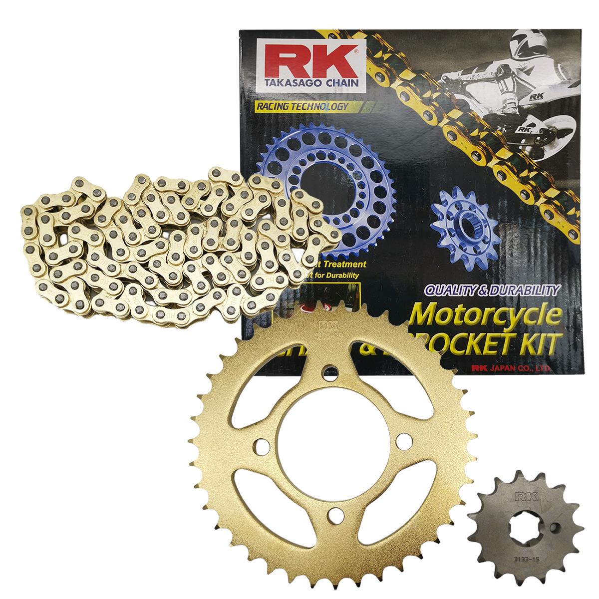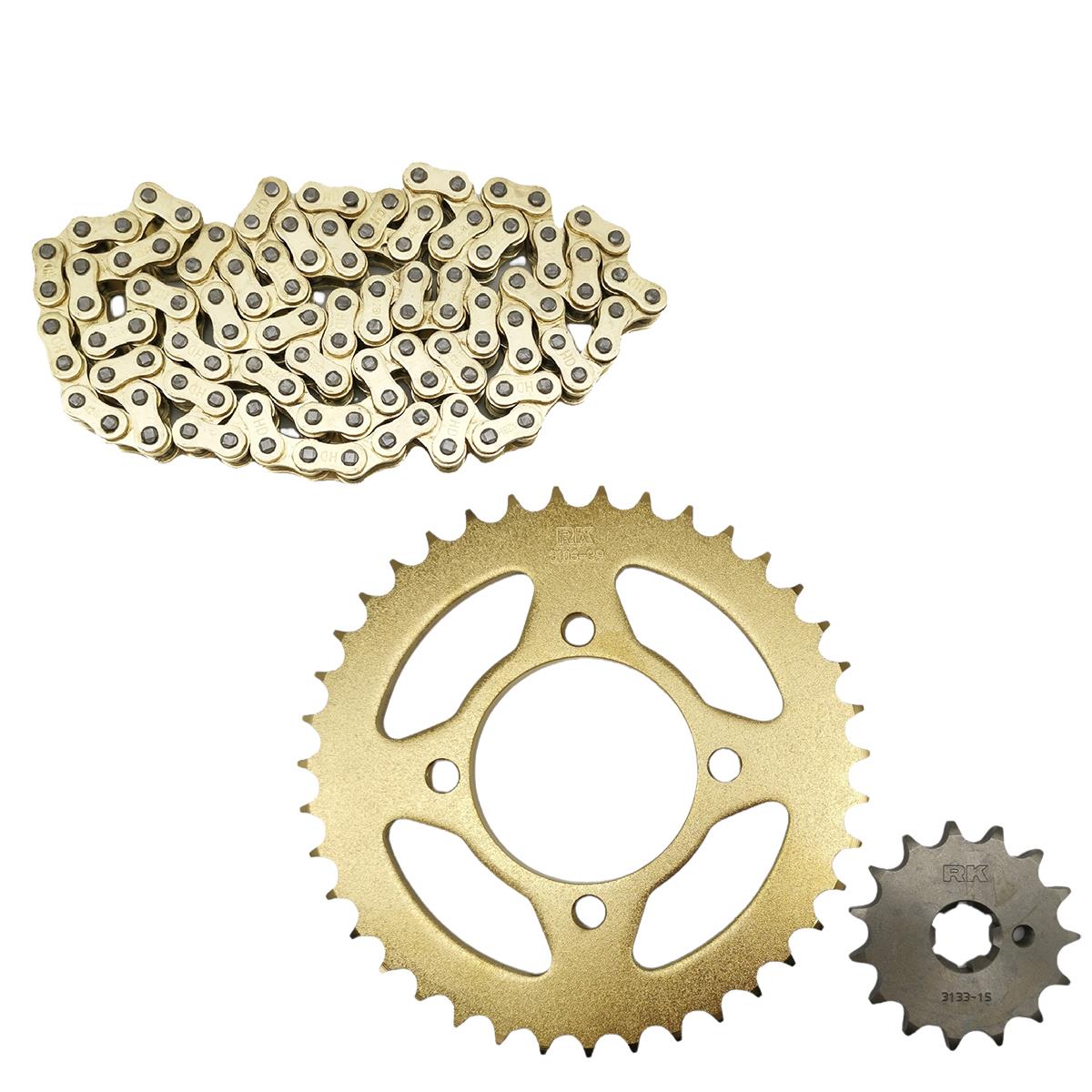 Αλυσιδογράναζα με ενισχυμένη χρυσή αλυσίδα 428SBGB-112L γρανάζι ρόδας 38 δόντια και γρανάζι κίνσηης 15 δόντια για Yamaha Crypton X 135 από την εταιρία RK