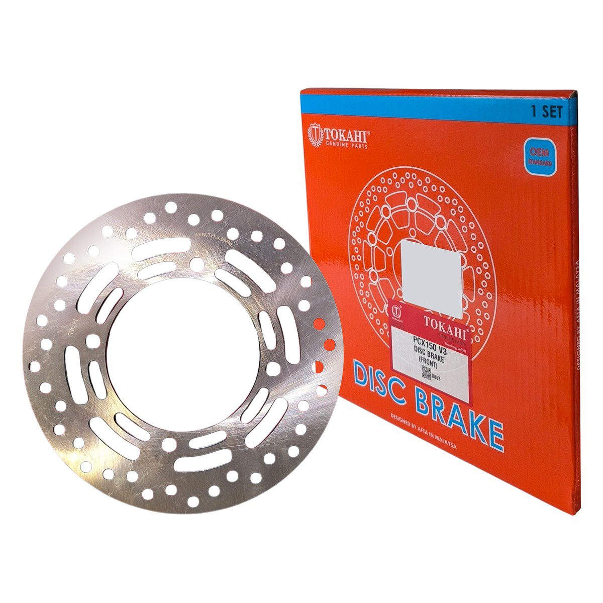 Δισκόπλακα εμπρόσθια Honda PCX V3 TOKAHI Η εμπρόσθια δισκόπλακα φρένων για Honda PCX V3 από TOKAHI είναι ένα στιβαρό και υψηλής ποιότητας εξάρτημα φρένων σχεδιασμένο για να αντικαθιστά ή να αναβαθμίζει τη δισκόπλακα του μοντέλου. Κατασκευασμένη από ανθεκτικό κράμα μετάλλων με πολύ καλή αντοχή στη θερμότητα και στη φθορά, προσφέρει ομαλή και αξιόπιστη πέδηση, σταθερή απόδοση σε διάφορες συνθήκες οδήγησης και συμβατότητα με το σύστημα πέδησης του PCX V3, συμβάλλοντας στη βελτίωση της ασφάλειας και της αίσθησης ελέγχου κατά το φρενάρισμα.